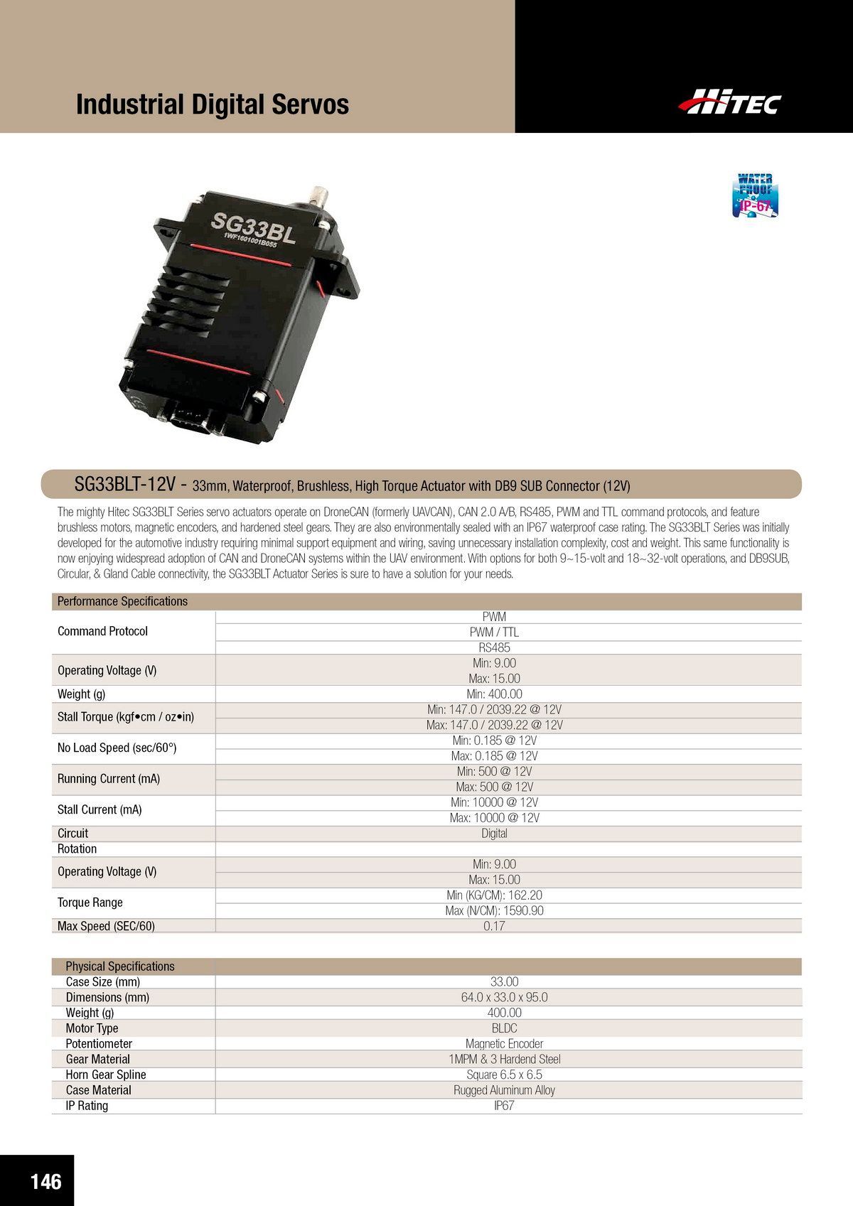 The mighty Hitec SG33BLT Series servo actuators operate on DroneCAN (formerly UAVCAN), CAN 2.0 A/B, RS485, PWM and TTL command protocols, and feature brushless motors, magnetic encoders, and hardened steel gears. They are also environmentally sealed with an IP67 waterproof case rating. The SG33BLT Series was initially developed for the automotive industry requiring minimal support equipment and wiring, saving unnecessary installation complexity, cost and weight. This same functionality is now enjoying widespread adoption of CAN and DroneCAN systems within the UAV environment. With options for both 9~15-volt and 18~32-volt operations, and DB9SUB, Circular, & Gland Cable c